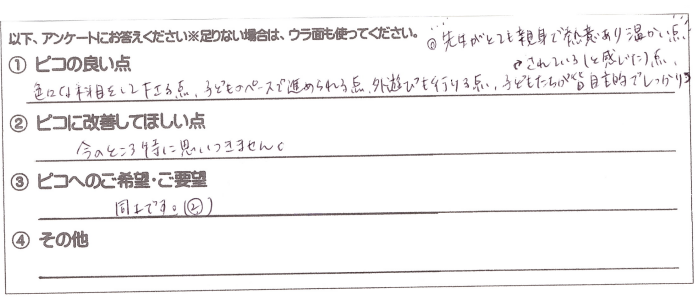 ・いつも温かいご指導ありがとうございます。1年前の我が子と比べて、いろいろな面で成長しました。今後もよろしくお願いします。