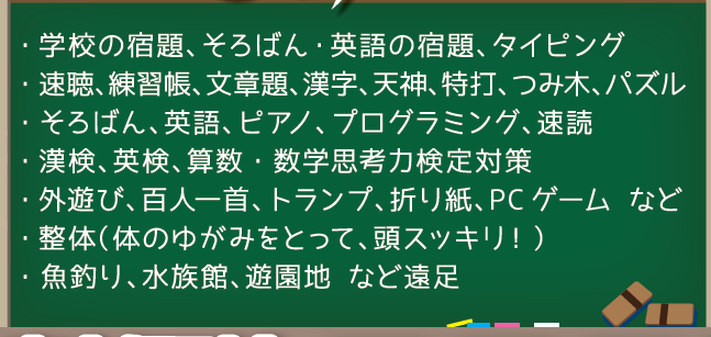 ※早く勉強が終わった方は、速聴・速読・タイピング・積み木・パズルなどを学び、学習能力(脳力)を高めます。